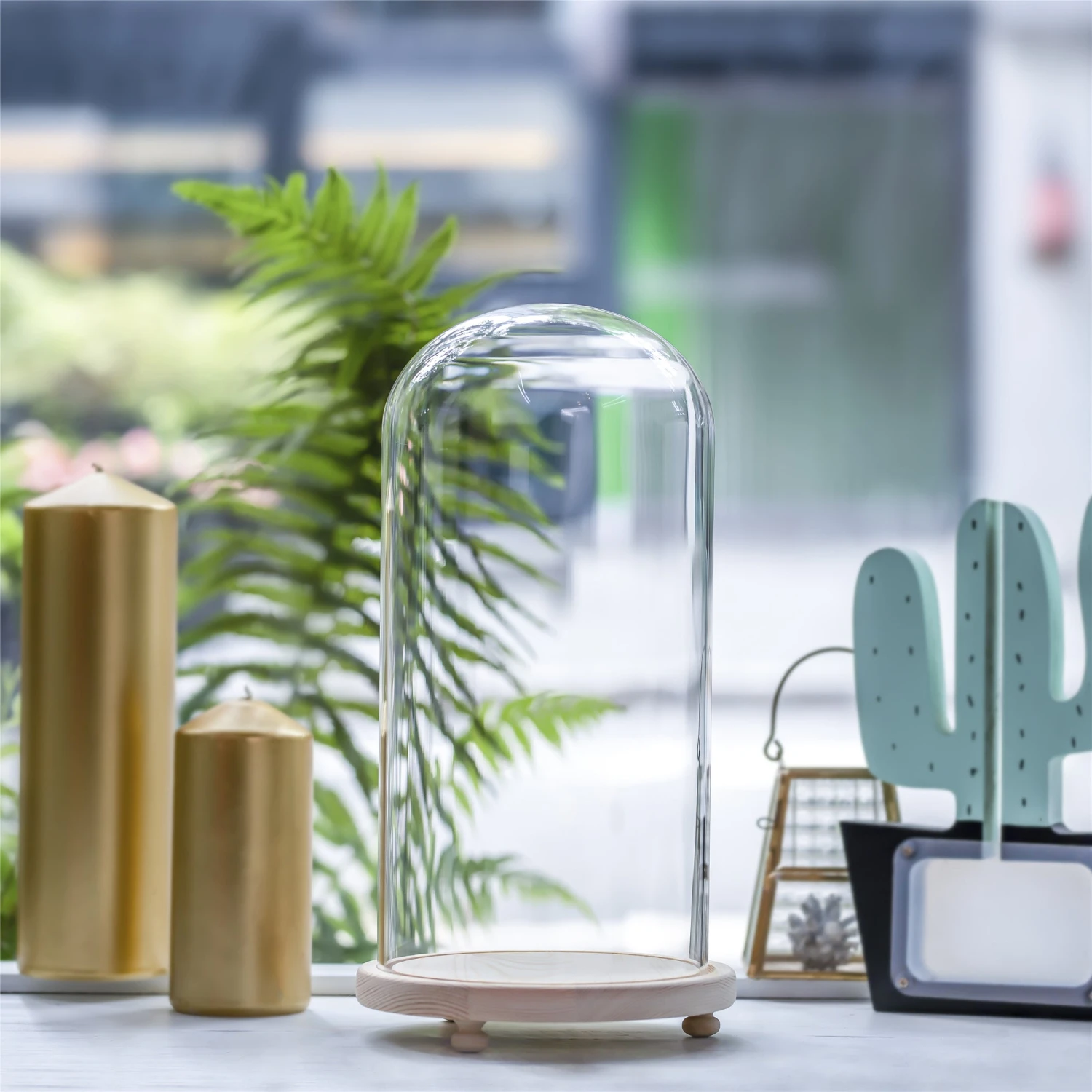 Handmade Glass Dome With LED Light Wood Base Cloche Bell Round For Rose Model Figurine Flowers