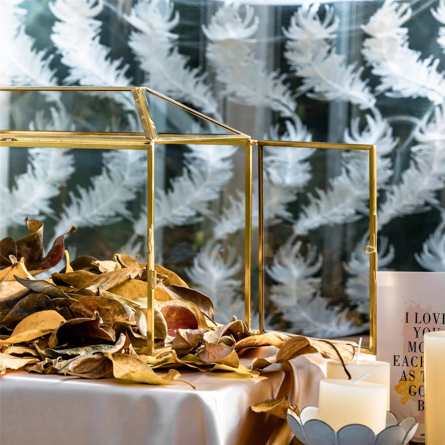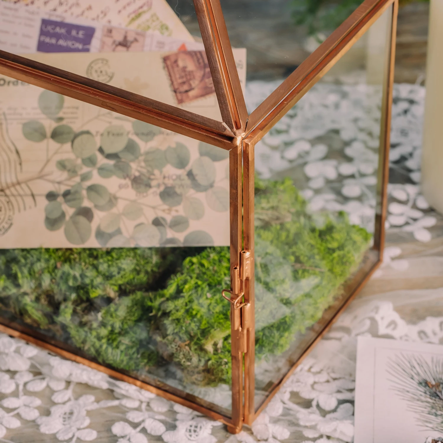 4. Vintage, the gold color is the natural color of brass, house shape geometric terrarium, with a swing lid to let cards get thru.