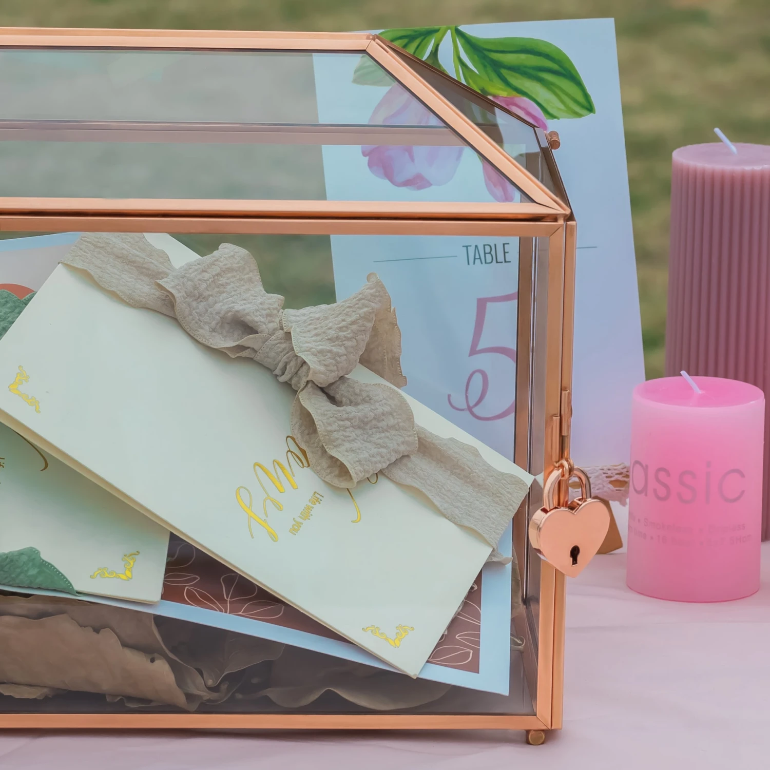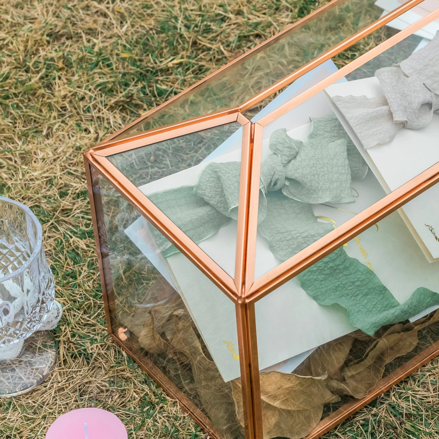 4. Vintage: gold is the natural color of brass, and the house is shaped like a geometric terrarium with a swing lid to let cards get through. It is ideal for forest, backyard, or vintage weddings.