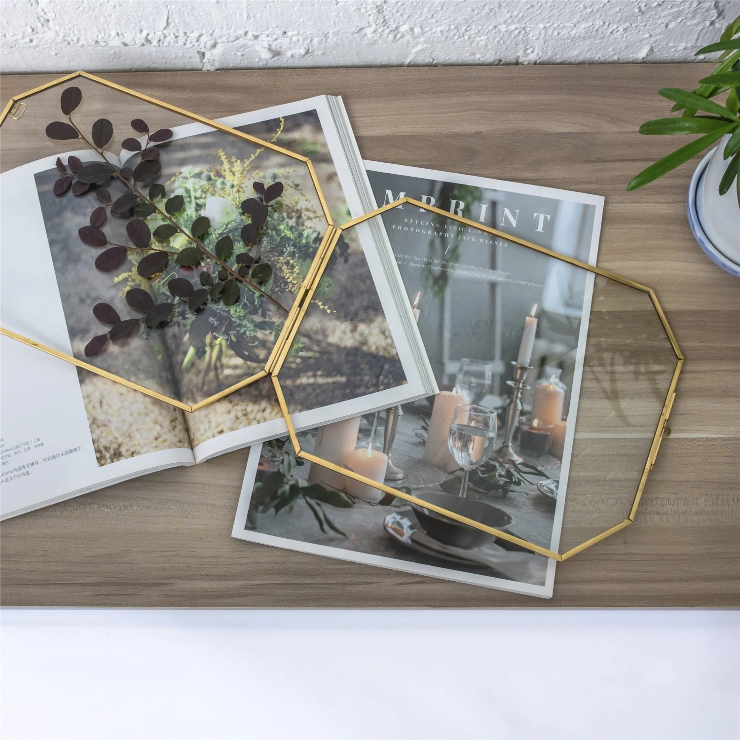1. Handmade long octagon double glass brass and glass frame with a natural vintage gold color, go well with pressed flowers and plants.